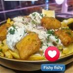 Combinatie van frietjes met verse tartaar, witte wijnsaus, lekkere stukjes gepaneerde koolvis, citroentje, peterselie